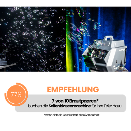 Die Seifenblasenmaschine bringt nicht nur Kinderaugen zum leuchten. Immer wieder gerne dazugekommen, wenn der Empfang draußen stattfindet oder auch in Verbindung mit der freien Trauung.
